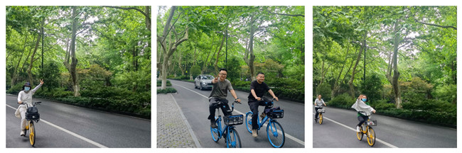本次活動出發點為虎跑公園,宏旭黨支部書記吳李芬闡述了本次活動的目的,黨支部宣傳委員金贊鋒帶領大家完成了熱身運動。隨后大家分成了兩組,每組安排了一名領騎,迎著清風,大家悠然騎行在梧桐樹下。