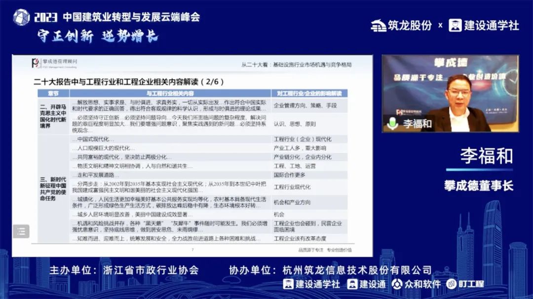 在新的要求和形勢下,建筑企業(yè)哪些機遇與挑戰(zhàn)呢?攀成德董事長李福和先生在《從二十大看:基礎(chǔ)設(shè)施行業(yè)市場機遇與競爭格局》中,通過二十大報告中與工程行業(yè)和企業(yè)相關(guān)內(nèi)容的解讀,指出綠色化、數(shù)字化、智能化是行業(yè)接下來的發(fā)展方向,對于建企來說,機遇與挑戰(zhàn)并存,要學(xué)會緊跟國家政策與戰(zhàn)略部署,尋找細分領(lǐng)域、所在區(qū)域機會,積極轉(zhuǎn)型。