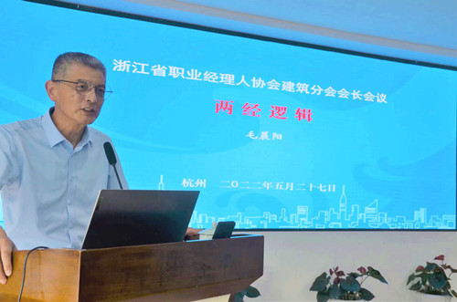 會議伊始,由鯤鵬控股集團董事長毛晨陽為大家進行了“兩經邏輯”的專題報告。他利用一張“資產負債表”展開分享,結合其自身研究的專業理論成果、實際管理經驗,與大家進行了面對面的探討、交流,表明了要重視項目前期策劃、過程糾偏,以及信息化、BIM等技術的應用。