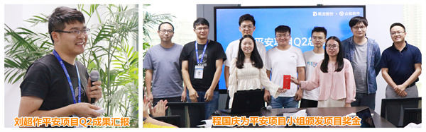 最后,由平安項目小組負(fù)責(zé)人劉超匯報平安項目Q2完成情況。2021年,眾和事業(yè)部承接平安建設(shè)集團(tuán)有限公司的信息化建設(shè)技術(shù)開發(fā)工作,確保其綜合信息管理平臺正常、穩(wěn)定使用。面對客戶需求多、急、大的困境,平安項目小組攻堅克難,日日加班加點,跨小組協(xié)調(diào)資源,圓滿完成了第二季度所有需求,促進(jìn)客戶方信息化管理水平的提升,得到了客戶的贊譽與肯定,事業(yè)部總經(jīng)理程國慶為他們頒發(fā)了項目獎金。