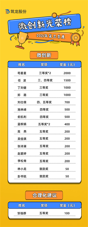 自今年四月推出微創新活動,筑龍公司各部門五十余名同學積極參與其中,從產品、服務、技術、數據、流程等維度,輸出74個“金點子”,促成可衡量、有價值、有影響力的成果,為公司經營管理的改進加足馬力。