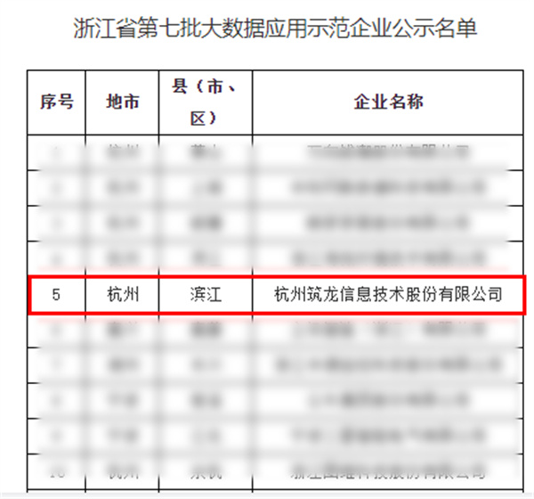 近日,浙江省經(jīng)濟(jì)和信息化廳正式公布浙江省第七批大數(shù)據(jù)應(yīng)用示范企業(yè)名單,杭州筑龍信息技術(shù)股份有限公司成功入選。