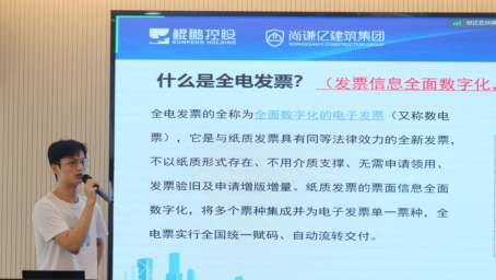發票的又一“改革”——全面數字化的電子發票(簡稱“全電發票”)自2022年開始已在多地開放試點。為切實做好全電發票上線后的一系列工作,確保財務人員熟練掌握全電發票的基礎知識,懂政策、會操作,也為增加業務人員的自身知識儲備,同時能更好地為客戶答疑解惑。6月25日,尚謙億建筑集團組織開展《全電發票上線的解讀》專題培訓,公司全體員工線上、線下共同參與培訓。