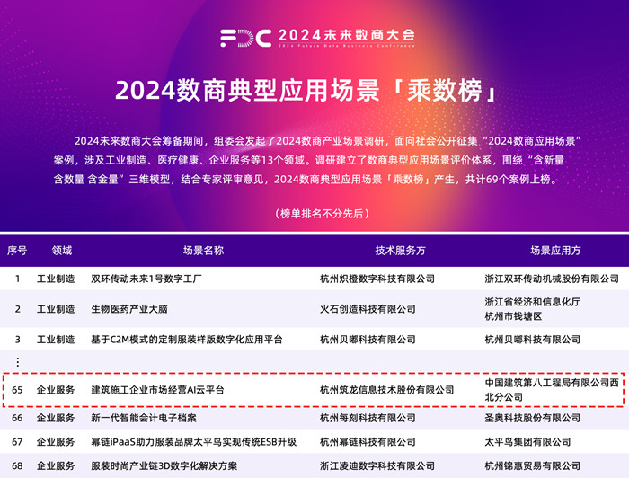 現(xiàn)場揭曉了2024數(shù)商典型應用場景“乘數(shù)榜”,并發(fā)布《2024數(shù)商產(chǎn)業(yè)場景調研報告》。作為建筑行業(yè)數(shù)商企業(yè)代表,杭州筑龍信息技術股份有限公司(簡稱:筑龍股份)實力登榜,成為本屆數(shù)據(jù)場景優(yōu)秀應用企業(yè)之一。這項榮譽不僅是對筑龍股份多年深耕建筑行業(yè)信息化的重要肯定,也為筑龍股份可持續(xù)發(fā)展奠定了信心基石。