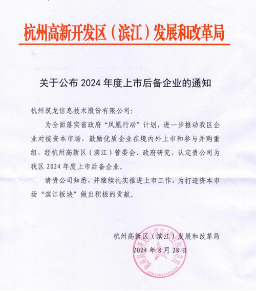 近日,筑龍股份榮耀入選杭州高新開發(fā)區(qū)(濱江)2024年度上市后備企業(yè)。這一榮譽(yù)不僅是對公司過往成績的高度肯定,更為筑龍股份未來資本市場征程鋪就了堅(jiān)實(shí)的基石,標(biāo)志著企業(yè)向公眾亮相邁出關(guān)鍵一步。